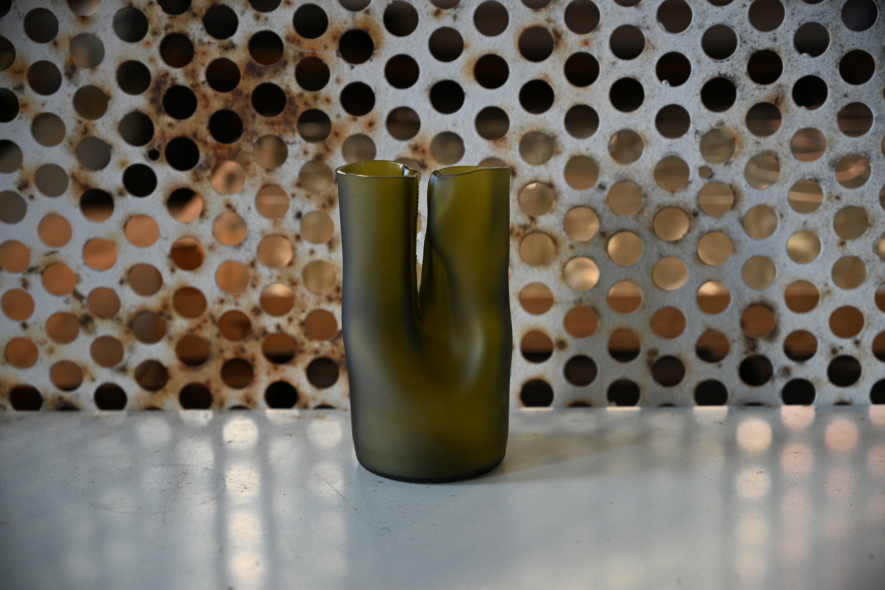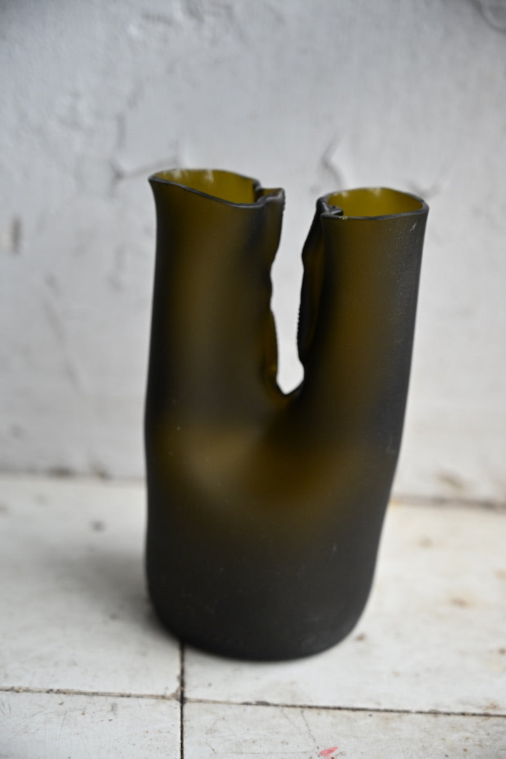 Coming full circle, these vases is created by authentic recycled wine bottles the color, thickness, and bottom shape differ from vase to vase. During our process the vase are fire polished to make a smooth, even and rounded edge. Then the twin bottleneck is manufactured  to give its unique appearance. The final step of the production stress relieves the glass and makes them dishwasher safe so you can enjoy using the vase for years to come.